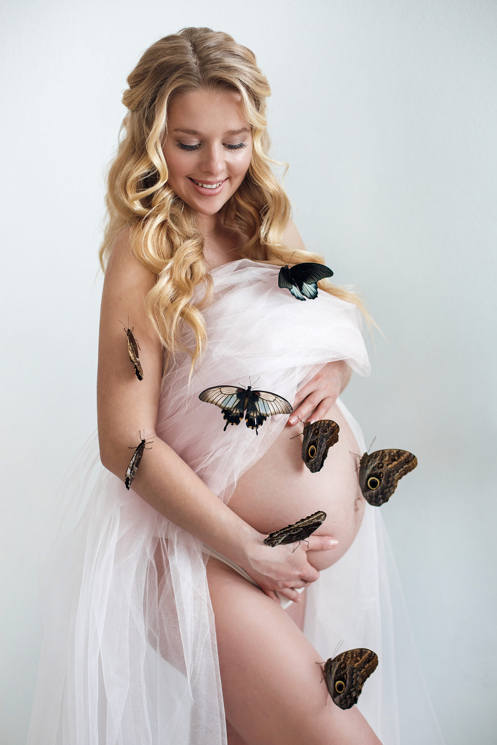 Durante la sesión, se guía a la futura madre en poses que resalten su belleza y el vínculo con su bebé por nacer. Se utiliza iluminación profesional para capturar imágenes emotivas y artísticas.